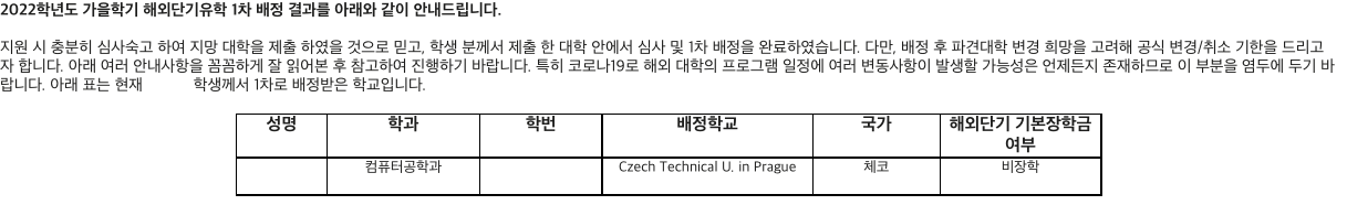 1지망 대학이었던 체코공대에 배정되었다는 메일이었는데 뭔가 이상했다. 비장학..?