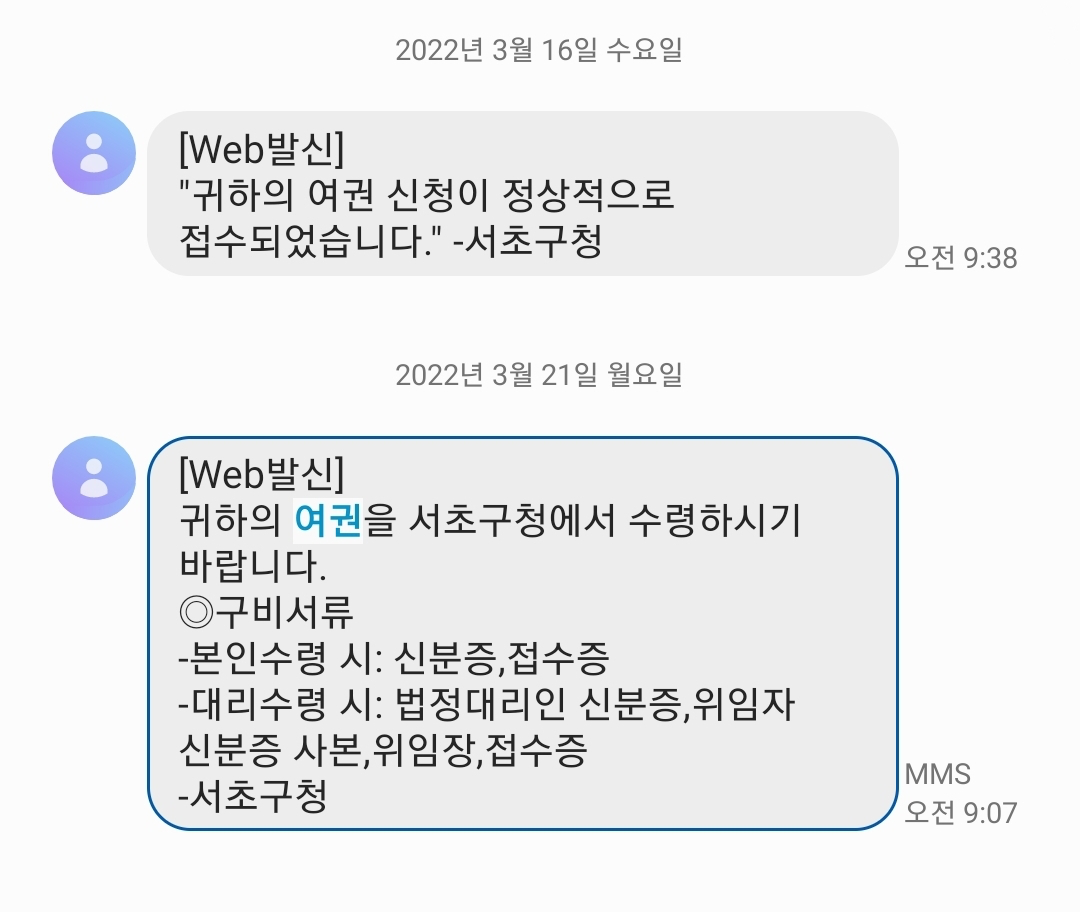 여권은 3월 16일에 신청해서 3월 21일에 수령했고, 최종 서류는 28일에 제출했다.