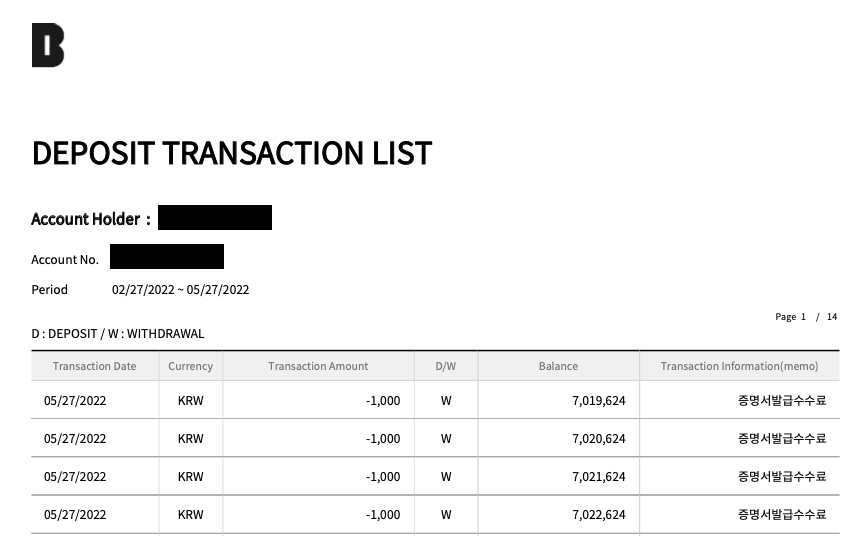 카드 뒷면에 서명 후, 앞뒷면 사진으로 찍어서 스캔하고 한 장으로 만들었다. 은행 잔고 증명서, 입출금 내역서는 앱을 통해 발급 받을 수 있었다. 발급 절차는 아래와 같다.